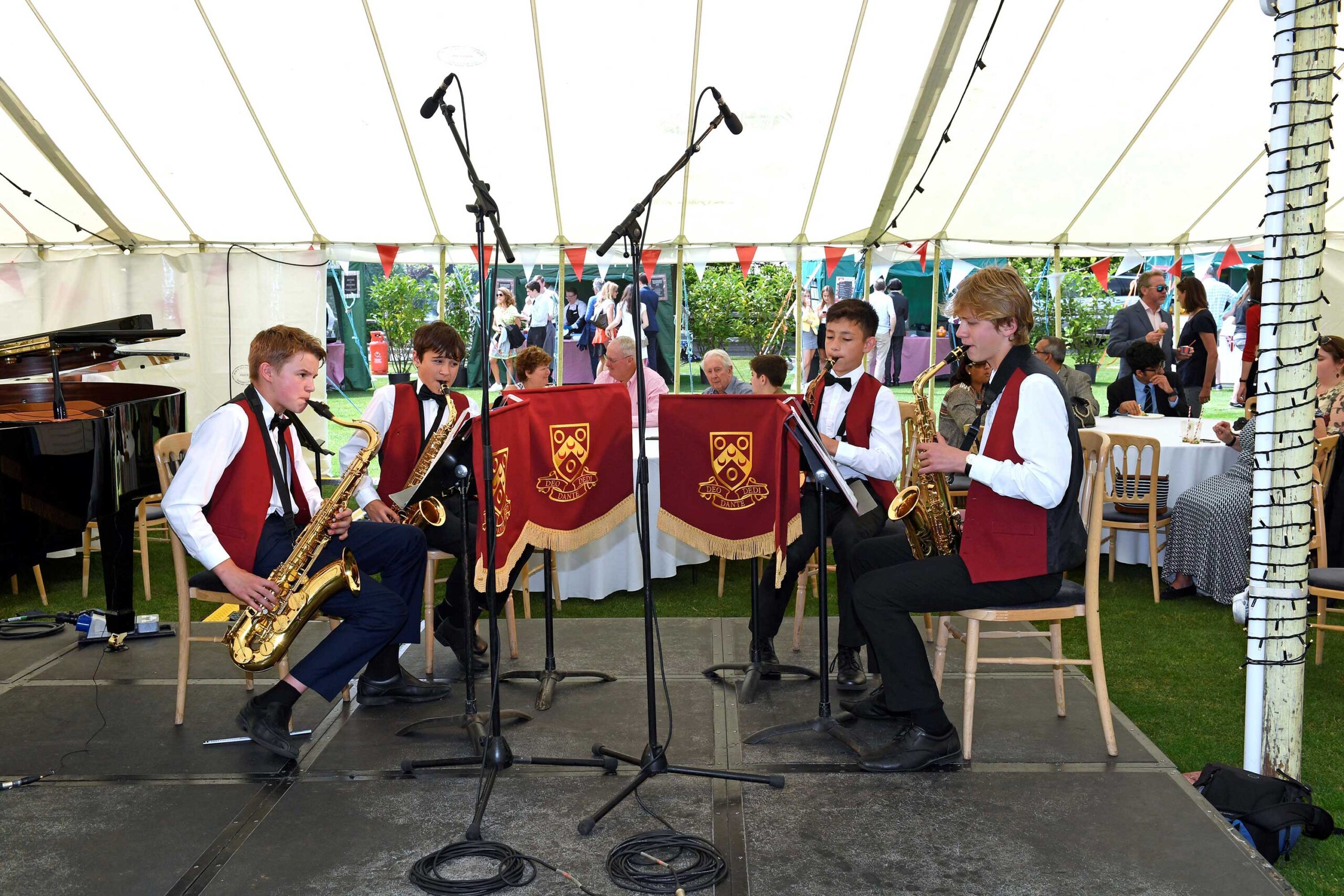 • A microphone connected to a separate amplifier, with two 10″ loudspeakers placed at either side of the stage